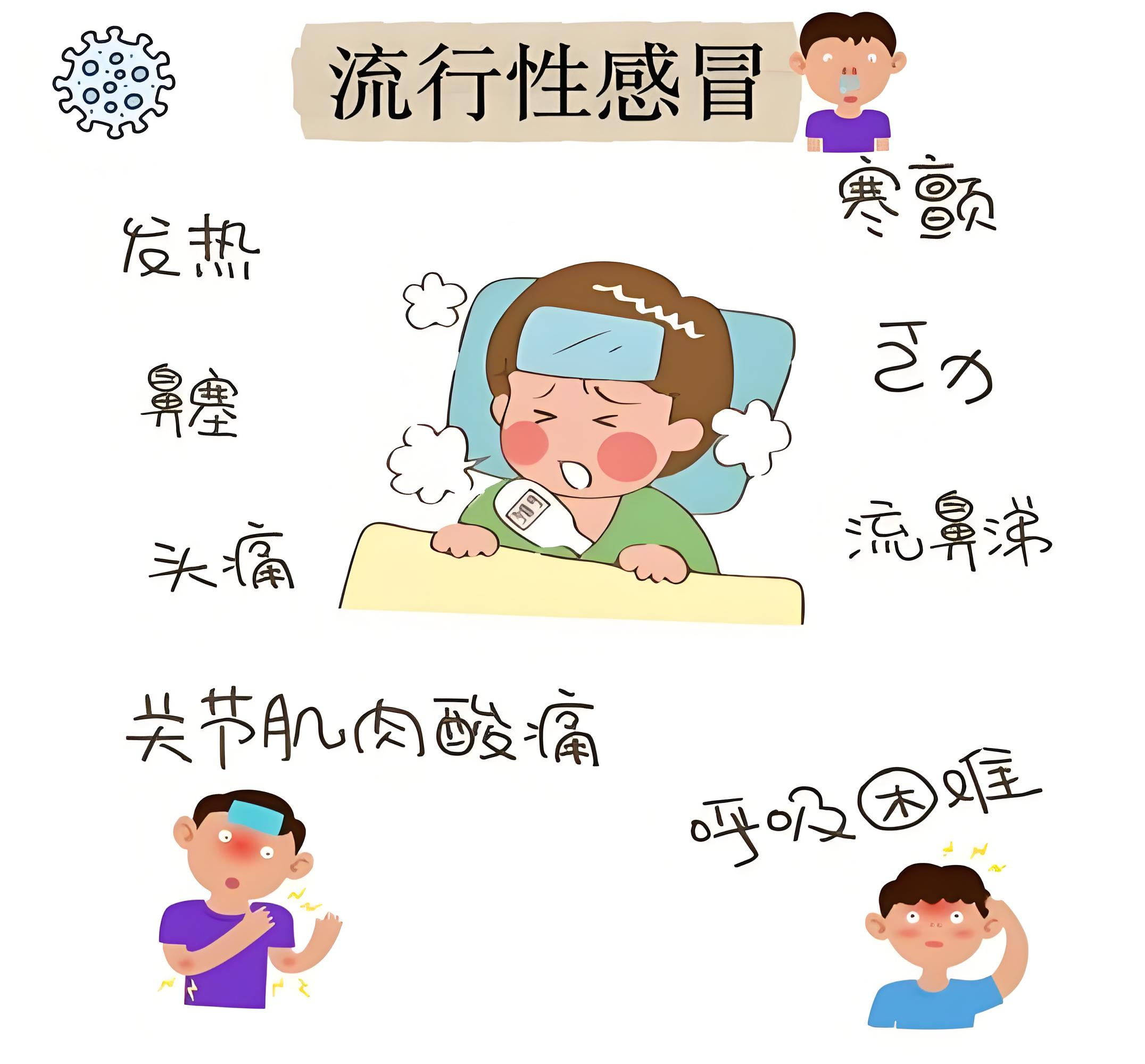 症状:突然发热(可达39℃以上)、头痛、全身酸痛、咳嗽、乏力,部分患者伴有咽痛、鼻塞、流涕等。